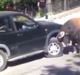 【人間め!】巨大牛、恐ろしい角を突きつけ車に襲いかかる映像が怖すぎる