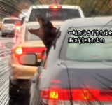 オレ・アメ・ヒトリジメ。車から雨を全て食べようとするドーベルマンのいる風景