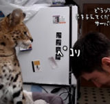 もしかしてそれはご褒美?サーバルキャットに頭を差し出し猫パンチを食らう男性。そのパンチ力が凄かった。