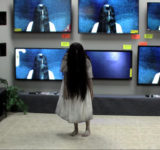 売り場のテレビの中から貞子が出てきた!家電売場のお客さんを恐怖が襲うホラードッキリ映像