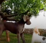 リンゴを取りたいのに取れない小さい犬、それを見ていた大きい犬は・・・