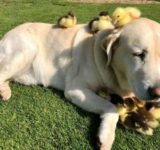 親鳥がいなくなったカモのヒナたち。そのヒナたちの母親役をかってでたラブラドール犬(イギリス)
